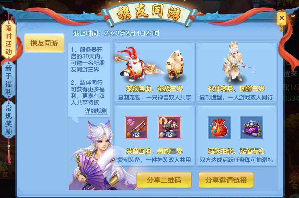 《神武4》手游本周神武世界里将会有哪些变化,先在这里为大家梳理一下本次更新维护的核心内容~ 【更新提纲】 1.宠物继承功能全服开放 2.110级副本“寒渊旧梦”全服开放 3.侦探大赛活动限时开启 4.“携友同游”活动限服开放 5.其他调整 宠物继承功能全服开放 1)携带等级≥65级的未满技能宠物,其所使用的元宵、兽魂果、饰物和宠物装备可花费一定银币继承到技能数量更多的同造型宠物上。 2)符合继承条件宠物在宠物界面造型旁会显示入口按钮,也可前往神兽使者处点击【继承宠物道具】进入宠物继承界面查看了解。 110级副本“寒渊旧梦”全服开放 1)本周五维护后,服务器等级≥105级的服务器开放寒渊旧梦副本。 2)等级≥110级的少侠可以在日程-副本界面或者说书先生处,进入寒渊旧梦副本准备厅,组成5人队伍即可参与寒渊旧梦副本。 3)寒渊旧梦副本分为普通难度和挑战难度: ①进入副本消耗5点副本次数,与日常副本共享次数。 ②普通难度可使用聚宝盒,开启后进入副本消耗10点副本次数,挑战难度无法使用聚宝盒。 ③进入挑战难度需要同一服务器的5名成员各消耗任意五宝作为门票,每周可以挑战一次。 ④挑战难度中,战胜怪物或者完成任务可以选择奖励组成旧梦宝库,通关副本后,将在旧梦宝库中产生通关奖励。 4)参与副本将获得物品与积分奖励。 5)商城增加寒渊副本商店,获得积分可以解锁潜能精研和飞雷将转生丹等物品。 侦探大赛活动限时开启 1.活动时间: 2023年1月6日至2023年2月2日 2.活动介绍: 1)活动时间内,每天21:00-次日1:00参与神武大侦探活动可以获得社交积分奖励。 2)非活动时间仍然可以参与神武大侦探玩法,但是无额外奖励。 “携友同游”活动限服开放 1)“携友同游”活动本周限【云中锦书】服务器开放。 2)服务器开放后30天内,当前等级≥服务器等级的角色即能以邀请人的身份参与活动,可在奖励-限时活动-携友同游中查看活动界面。 3)如果新玩家是实名认证下首个帐号的首个角色,可以长按系统打开同游绑定界面,输入邀请人的邀请码绑定同游关系,该关系持续30天。 4)每名新服邀请人最多绑定一名同游角色,双方在活动期内可互相复制装备、宠物,也可将伙伴变身为对方造型,享受双人同游的乐趣。 5)绑定关系期间,双方完成每日活跃任务后还可获得同游礼包,礼包可在同游关系结束后打开,有机会获得稀有道具奖励。 其他调整 1.好友密令调整 等级≥60级,好友数量上限≥75的少侠可额外在红线童子处购买2个好友密令。 2.新增【伙伴卷轴包】限服售卖 限【今夕何夕】【二〇二三】及后续的服务器,神秘商城新增【伙伴卷轴包】售卖,服务器等级达到65级且角色等级达到65级后可购买,每个赛季限购一个。 3.新版伙伴天赋调整 1)【抵消】调整为仅对存活伙伴生效,不再对倒地伙伴生效。 2)【众志成城】提升了天赋增加的伤害,新增若己方有单位倒地时己方伙伴造成伤害降低,受到伤害提升的效果。 3)属性天赋加成效果调整为仅和伙伴基础属性相关,不再受重置属性影响。 *以上是无忧带来的一手爆料* *最终效果可能会有所调整* 扫一扫以下《幻唐志手游》二维码,根据自己的手机(安卓版、IOS版),下载对应的幻唐志手游客户端!赶紧邀请小伙伴,一起畅玩游戏! [编辑:ssc]