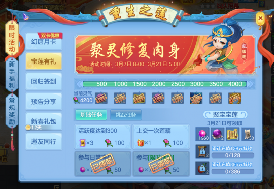 《幻唐志》手游维护更新,本周五维护后少侠们就可以在游戏中捕捉新宠物,拜月灵狐(95级)和雷司(飞升125级)了,同时少侠们可以参与游戏内活动,提前洗宠并储备养成道具,一起来看看吧! 重生之莲 哪吒肉身被毁,需要聚集灵气为其重塑肉身,完成任务可聚集灵气并获取特制洗宠券、还童丹、简易通灵符、神兽之灵和高级魔兽要诀等奖励,部分奖励将被存储在聚宝宝莲中,3月21日可领取。吉祥看起来每天上线做做日常就能获得不错的奖励耶! 每天300活跃获取3个特制洗宠券,马上就能洗新宠物!吉祥日常挑战+限时活动每天能获得大量还童丹,活动持续14天,积累灵气还能领取各种道具,3月21日登录岂不是能一次性领取不少好东西! 是哇!对新宠感兴趣的少侠可不要错过了这部分的福利哦! 新服也能获取不菲的储备血脉源石!吉祥噢~ 话说那个莲藕是什么东西啊?要如何获取莲藕上交呢?无忧莲藕的获取就要提到守护宝莲这个活动了。 守护宝莲 哪吒降妖除魔时肉身被毁,万幸灵珠未毁,现置于宝莲之中,限时守护宝莲抵御妖魔。无忧少侠们通过挑战能获取到仙灵莲子,在家园内种下且到达收获期即可领取莲藕,上交给太乙真人即可领取奖励。无忧除了简单和困难挑战外,少侠们还可以挑战难度更高的魔将首领。 每周各等级分区首通队伍和各门派首通角色将获得包含珍稀称谓的奖励。吉祥哇!不多说了!周五见! 本周五维护后,参与活动可以领取到特制洗宠券、储备还童丹、储备简易通灵符、储备高级兽诀等超多洗宠道具,对新宠物感兴趣的少侠可不要错过啦! *以上是无忧带来的一手爆料* *最终效果可能会有所调整* 扫一扫以下《幻唐志手游》二维码,根据自己的手机(安卓版、IOS版),下载对应的幻唐志手游客户端!赶紧邀请小伙伴,一起畅玩游戏! [编辑:ssc]