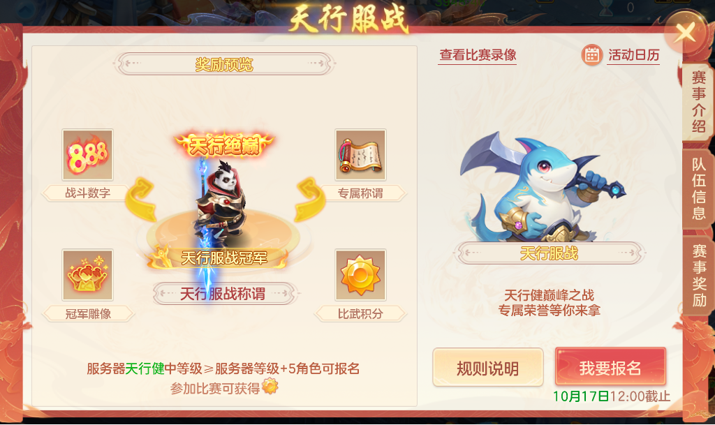 《幻唐志:逍遥外传》周末开打比赛!天行服战活动今日报名开启!一起来鉴赏下大服排行前三的宠物吧~ 苍叶猫暂居第一,攻、防、速都是上佳! 第二名由罗刹女夺得,法、速资质都十分出色。 想必这个雷光鼠就是第三名了吧,看起来也不逊色第一第二噢~ 天行服战活动天行健 服务器正式开放天行服战活动,10月17日前可报名,18、19日将开启预选赛及淘汰赛,决出金秋大服巅峰战力! 我还是搬个小板凳安安心心观赛吧。我猜上面排行榜这些宠物可能也会出现在赛事当中! 扫一扫以下《幻唐志手游》二维码,根据自己的手机(安卓版、IOS版),下载对应的幻唐志手游客户端!赶紧邀请小伙伴,一起畅玩游戏! [编辑:ssc]