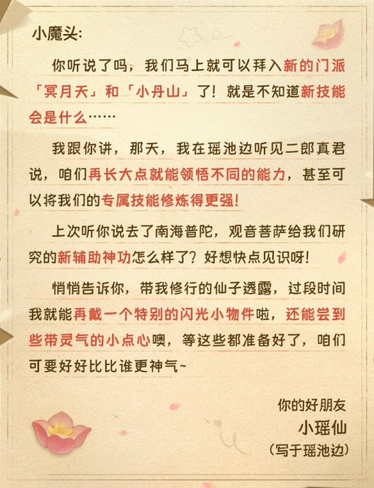 幻唐志逍遥外传听说关于新子女的消息,这封信里都有噢,快来看看吧!我最近在长安城碰到小魔头了,他说小瑶仙给他写了封信,感觉这信里有不少重要的信息—— 信上提到了新子女门派、新子女神功等等,还有新的子女能力?!看来子女们的培养玩法会更多元了!冥月天子女的技能应该是嘲讽敌方,辅助神功肯定能复活队友,你觉得呢? 扫一扫以下《幻唐志手游》二维码,根据自己的手机(安卓版、IOS版),下载对应的幻唐志手游客户端!赶紧邀请小伙伴,一起畅玩游戏! [编辑:ssc]