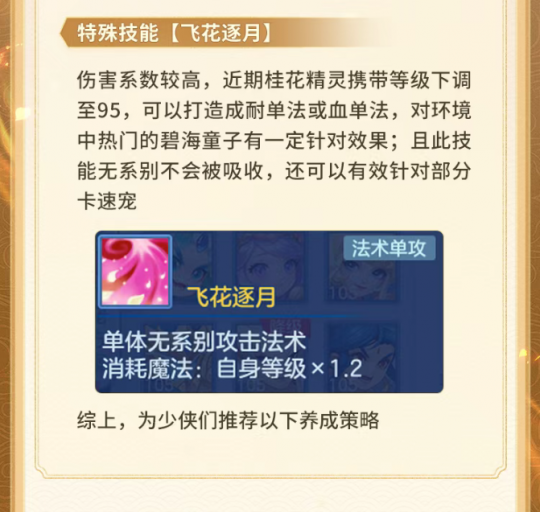 幻唐志逍遥外传宠物攻略:桂花精灵在去年11月的更新调整中,携带等级由105级下调至95级。它有不错的速度及法力资质上限,且拥有无系别单体特殊技能【飞花逐月】,其天赋还具备克制技能增伤! 扫一扫以下《幻唐志手游》二维码,根据自己的手机(安卓版、IOS版),下载对应的幻唐志手游客户端!赶紧邀请小伙伴,一起畅玩游戏! [编辑:ssc]