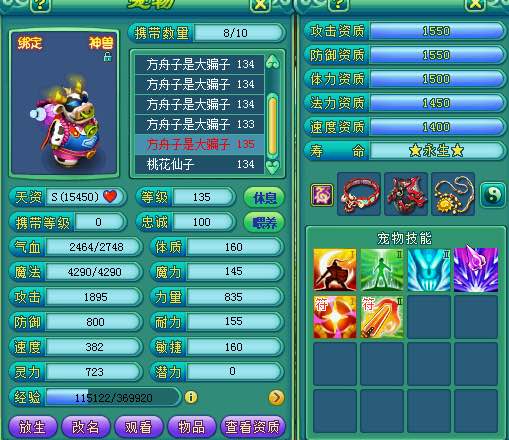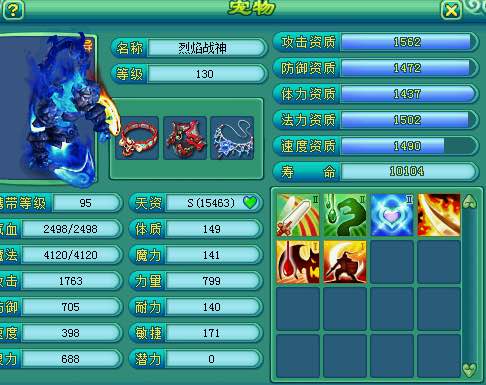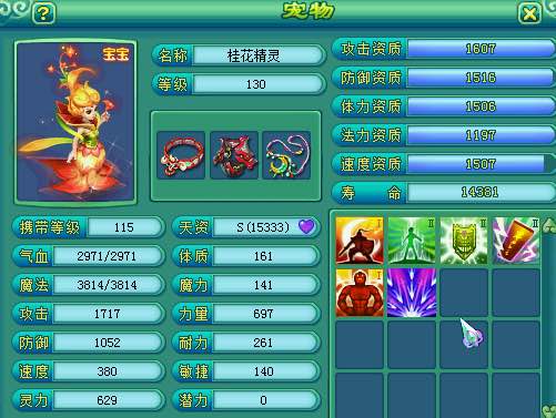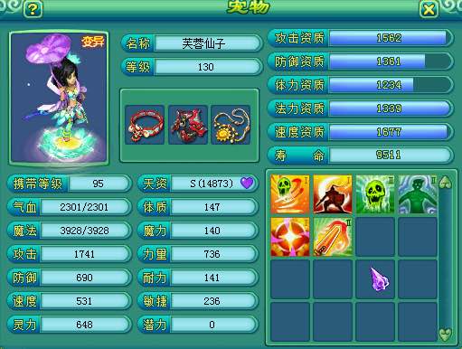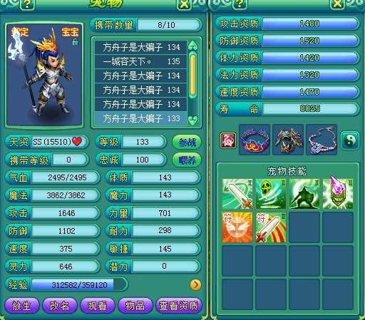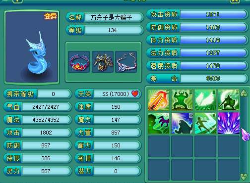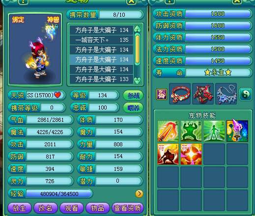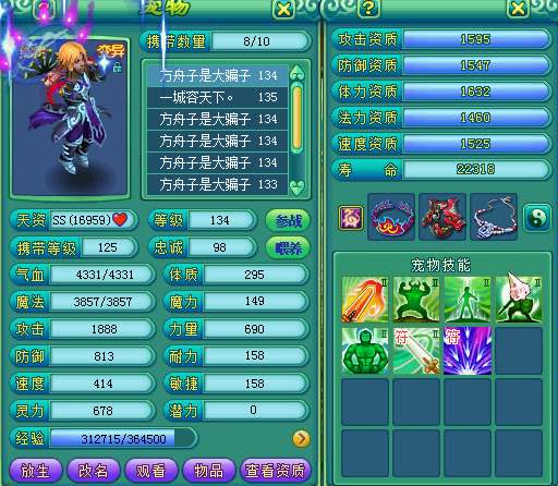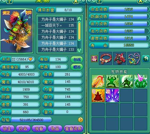 神武碧雪情天130狮驼展示,人物属性不算非常亮眼,宝宝也还行,亮点在物品栏里。