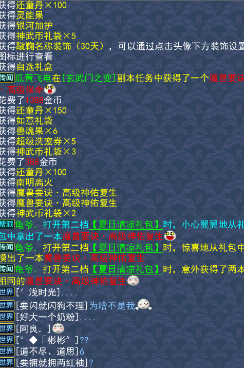 《神武4》电脑版新鲜事,一起来看看最近都有什么好玩的事情发生?在这里每天都会和大家分享三界新鲜事。接下来,一起来看看今天为大家带来的投稿吧~ 白石山黄小媛(夏日奇谭) 拿阳寿换来的三红项链嘿嘿 轻轻松松打出极品特效项链,虽然双加属性不够完美,但小昕还是好羡慕啊。发现最近少侠们各个运气爆棚,是不是大家偷偷吸了,小昕的欧气呀,难怪小昕最近运气那么差... 刘晗君(一露有你) 3破。我一个都不想要 破耐式、破魔式、破敏式,三式必须选一式的情况下,少侠会选择什么呢? 浅画白霓裳.ら(天下无双) 其实,奶粉号才是主号对不对 在洗宠券和夏日狂欢的加持下,少侠洗出了一只6技能幽灵虎(还触发了洗宠祝福),随后打开夏日清凉礼包时还获得了两本高级神佑复生!!为什么!为什么小昕开到的却是两本高级慧根! 欢迎在下方留言讨论,了解更多幻唐志的相关内容请关注 叶子猪幻唐志专区。 [编辑:ssc]