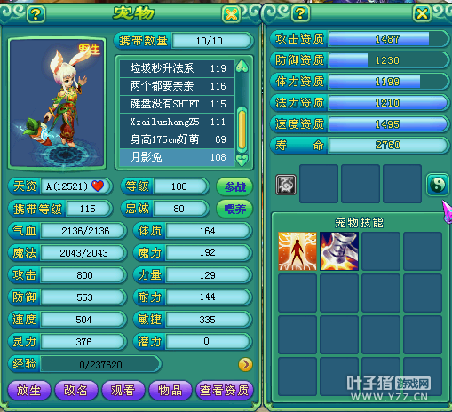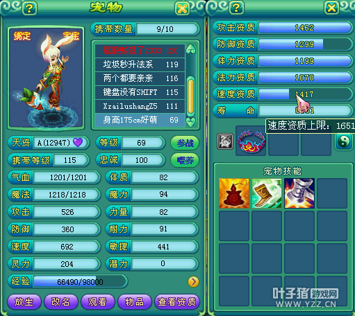 相关资讯: 这只是之前洗的月影兔,没出变异出了满速度成长的,立即转做千速宝宝了。 好了,野生的月影兔抓好了,通灵符搞起! 等等,去傲来祈福看下有没有宝宝祝福先。 转了2次,还是没有好祝福,那就这样吧,不祈求了。