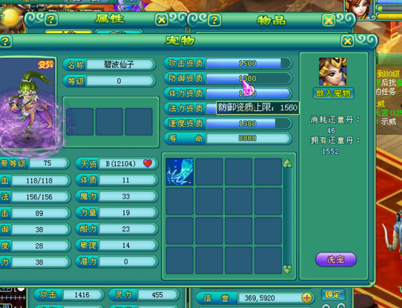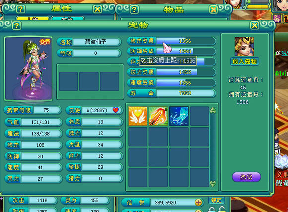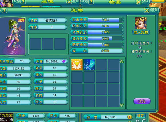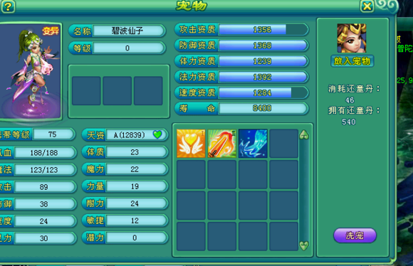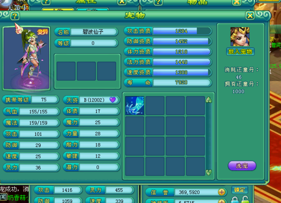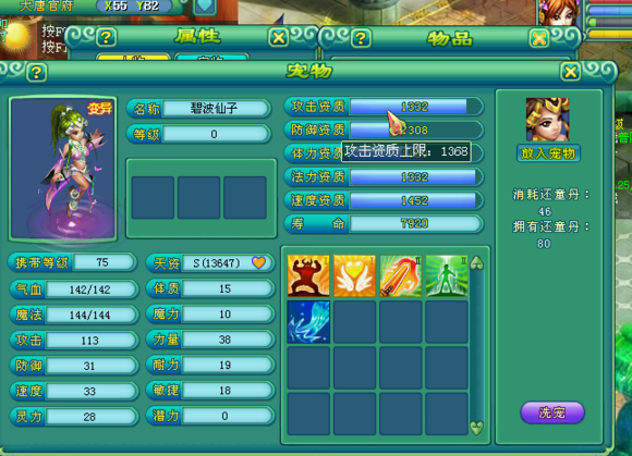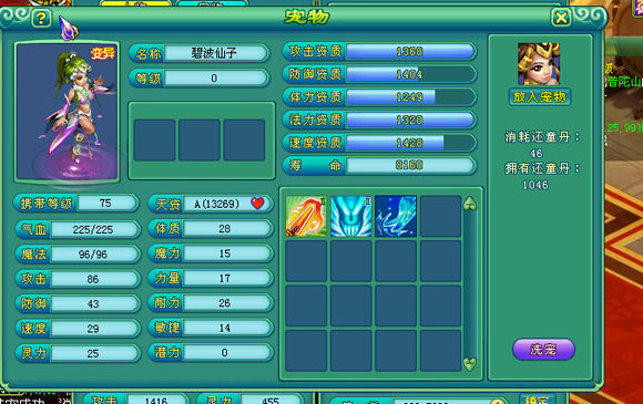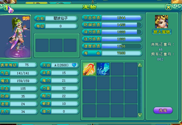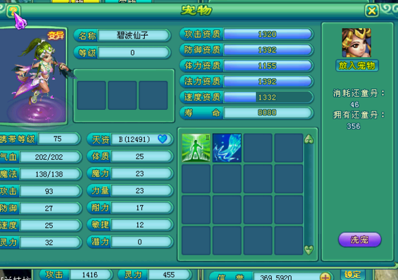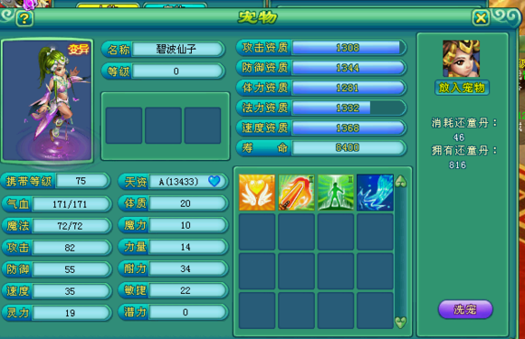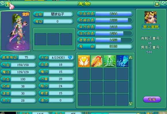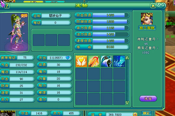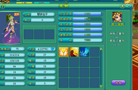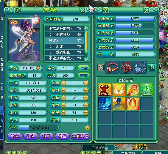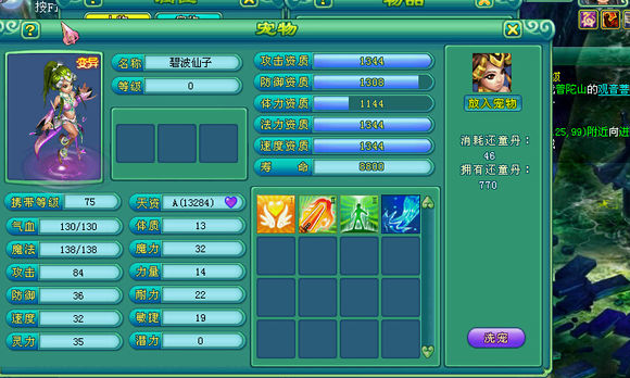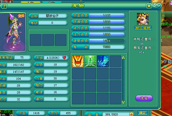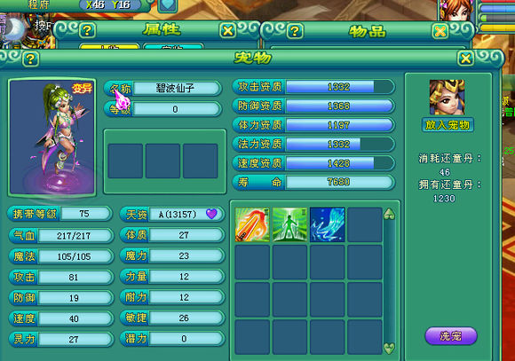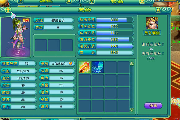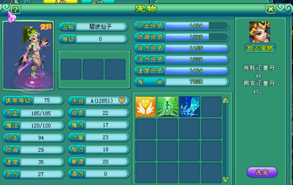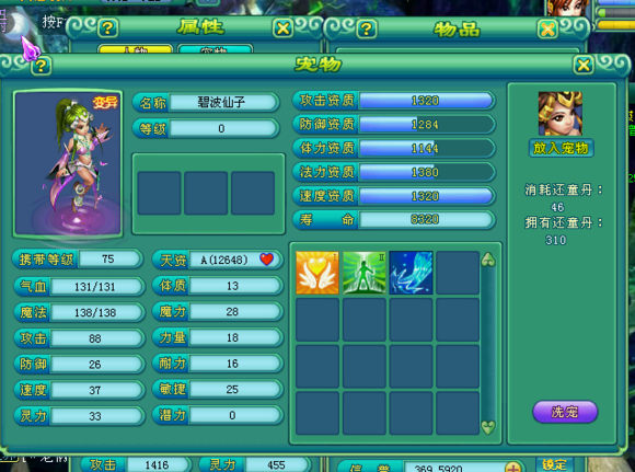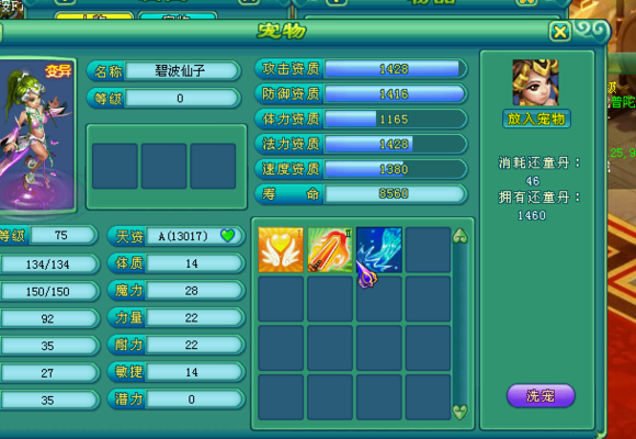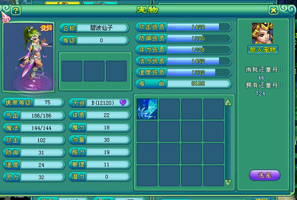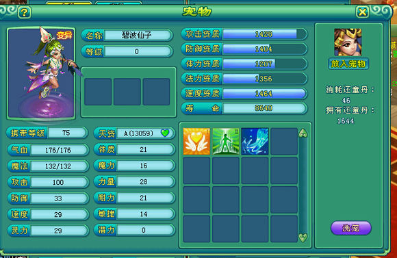 相关资讯: 秒升75换个碧波仙子,通灵符已准备好,变异妥妥的,幸好真的来5技能了,就是资质差了些,补满元宵依旧风骚。