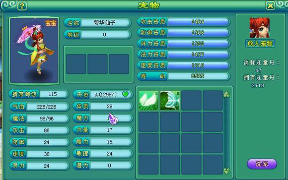 相关资讯: 通灵一只月光宝宝,绿心五技能也是能接受的,剩下3000多丹直接洗萼华仙子,越漂亮的越毒性,这句话果然是没错的,萼华仙子洗宠失败。