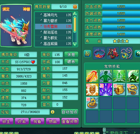 神武2以备神兽饰品,就差一个神兽之灵了,奈何FB空车,历经重重险阻终于凑齐了这最后一个神兽之灵,拉出奶粉号的神兽雪精灵来吸吸运气;换来的逍遥神牛带上饰品,加上染色,恩,还是不错的。