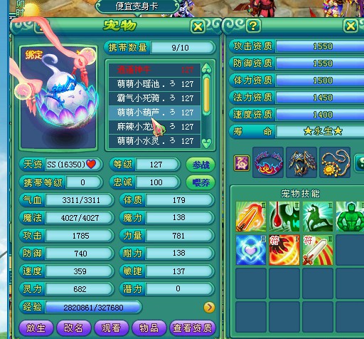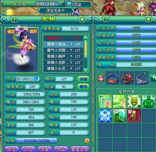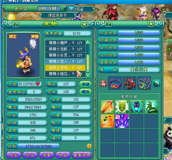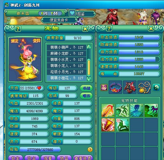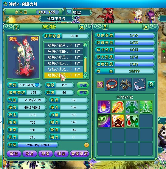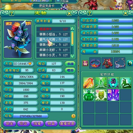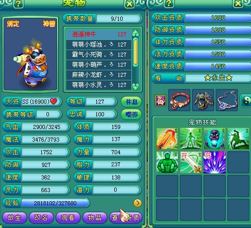 剑荡九州122飞升化生,三只神兽,宝宝全变异高书,作为辅助装备技能全满。