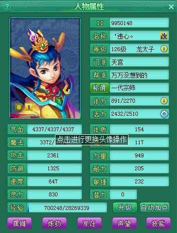 126天宫个人展示,攻击2361,装备有特技,蛟龙三件套,宝宝全变异;
