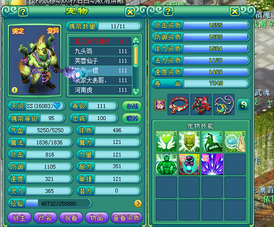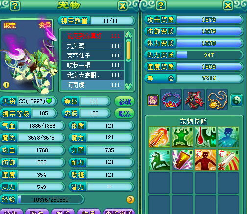 相关资讯: 106极品龙宫,一线属性再加上极限装备,还有群法小精灵,最最最牛逼的就是宝宝了,全是变异多技能宝宝。