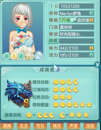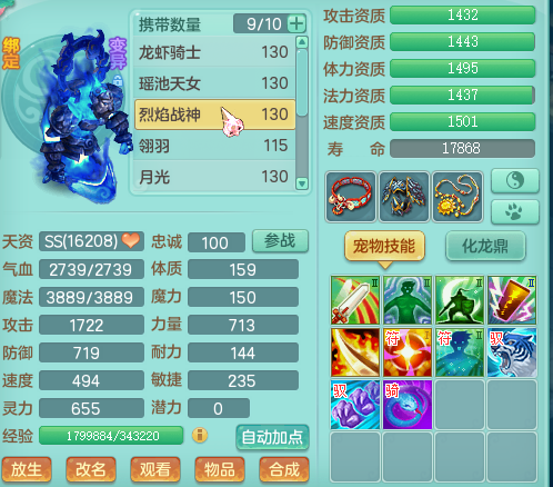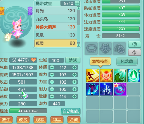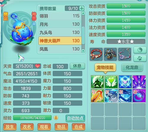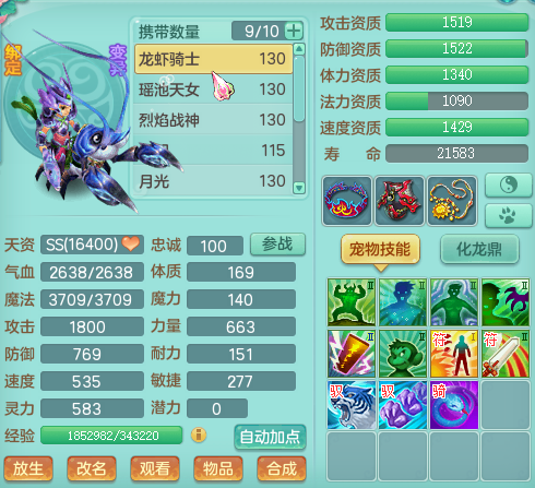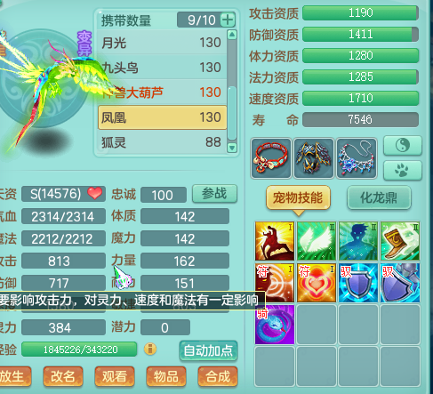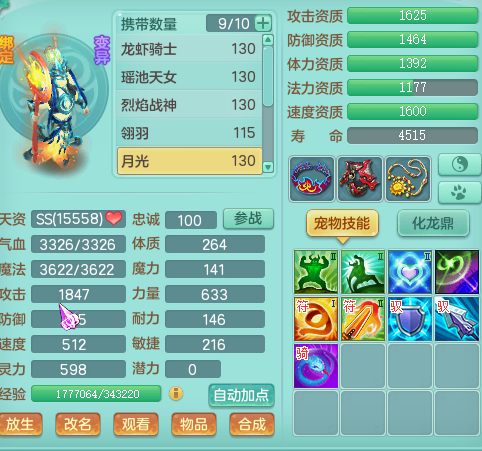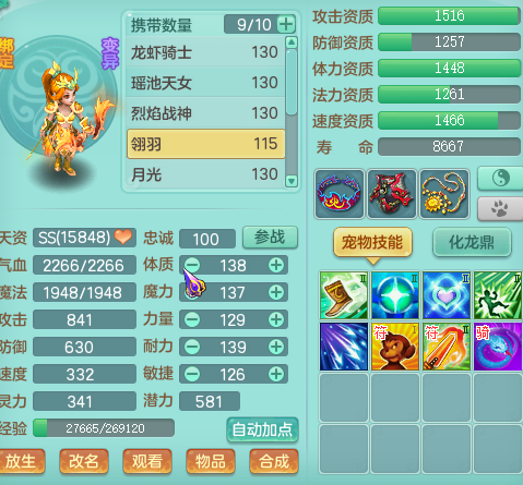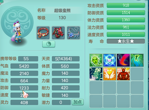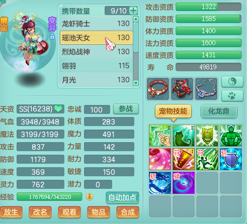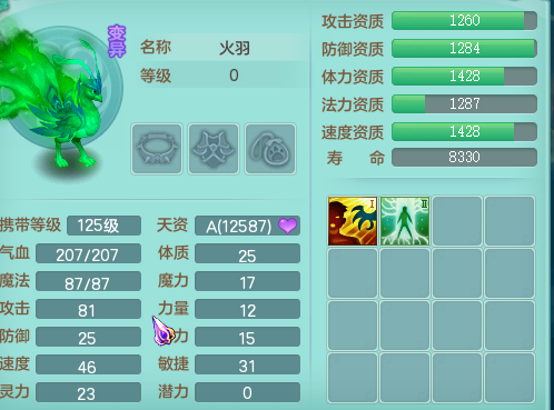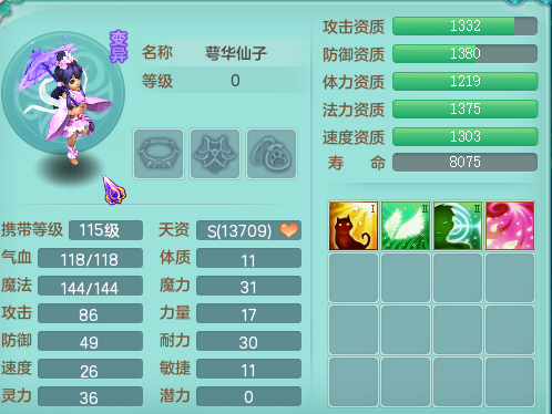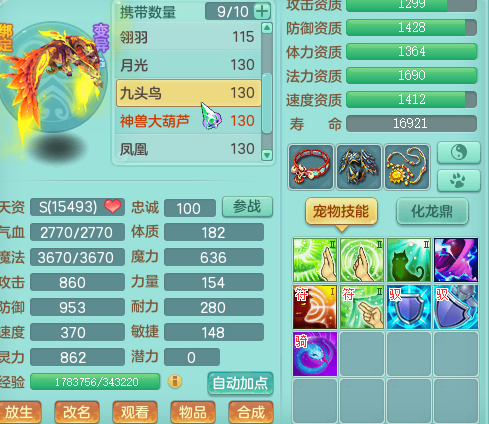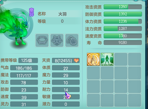 飞升125盘丝,一个玩游戏是不会冲钱的;拍卖点为证;当然自己不冲钱不代表没有金币;看职业就知道,压根不会为头像、坐骑、宝图发愁;但看这个拍卖点也看的出来,是没有多少投资的,更别说花钱洗宝宝了。 这位玩家有个爱好,就是喜欢去抓变异,下面是一起来看看这一年的成果。当然了,像那种龙女天兵大嘴鸟一类的变异,就不发了,早已放生。 白天用的隐攻,传说中的一刀一千速的六技能龙虾。 改点中的耐法五技能瑶池。 快被淘汰的五技能烈焰,就等着新宠影卫。 没打好书的深坑五技能翎羽 辣鸡变异四技能月光。 后打算回炉的,不知道有没有必要了,两难抉择的变异四技能九头鸟。 副本神兽,无饰物无内丹的剑气大葫芦。 变异四技能凤凰千速。 接下来是一些半成品,有没有打好书的,还有一些没有洗好的宝宝。 比如没打好书的六技能狐灵。 没洗好的萼华仙子和两只原谅色的火羽。 还有一只月影兔。 一共买过两张通灵符,一只死骑不过已经放生了,一只月光,剩下的所有变异都是野外抓来的。PS可以卖现金,一个月卖200块轻轻松松。 精良符石虽然加的属性低,但是总比没有好。 孩子资质有点低,但是舍不得花钱刷资质,这样也能用。 这个孩子的资质就更加低了。 其他的不说,单单是这成堆的变异就够小编羡慕很久了,神武2确定是个很公平的游戏,花钱和花时间,你具备其中一个,总是会变强的。 不说了,小编去野外抓变异去了。 [编辑:Hi、何同學]