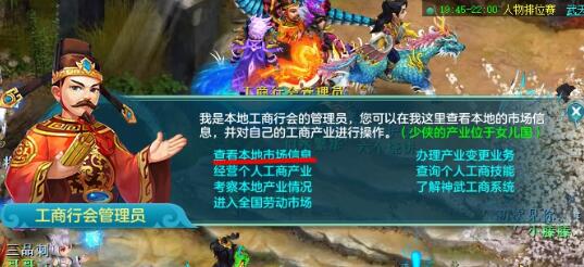 当然也可以选择去挖墙脚:考察本地产业情况-选择一个产业-挖! 在搞定员工后,我们开始着手商品的买卖(划重点)。 首先看看 面板左下角的 市场行情 这个面板是当前区域商品的价格,每个地区都有自己的价格表。女儿国到傲来比较好卖到钱的商品是丝绸、木材、水果、石料 这四样东西可以保证卖到傲来是不会亏本的(有时发现木材在长安比傲来价格卖的高) 记不住就截个图吧。 然后我们飞到傲来看看行情 对比下,发现提到的4种商品 女儿 比 傲来 的价格分别低5、8、9、12得到需要的信息后回到女儿,开始倒买倒卖,在女儿工商那点击 买卖商品 |