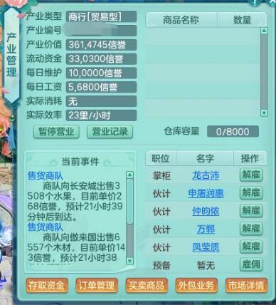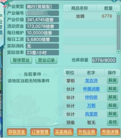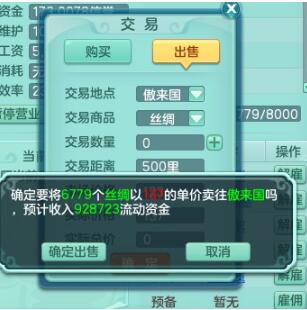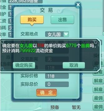 这个就是买与卖的界面。 这里提一下,一种商品购买时实际总价不能高于80W信誉,一天可以发出3次商队,每个商队的商品都不能相同。 说一下如挑选商品,比如丝绸是每个赚5元,118元购买一个80W信誉可以购买6779个卖出去,实际赚到的是5*6779=33895 对比其他3种商品: 木材:每个赚8元,80W信誉可以买6666个,8*6666=53328 水果:每个赚9元,80W信誉可以买3508个,9*3508=31572 石料:每个赚12元,80W信誉可以买3508个,12*3508=42096 所以在这里这次3种商品是丝绸、木材、石料 填好最高的商品数量买好要出售的商品 购买后你会发现仓库里多出了6779个丝绸,因为仓库最大只能容纳8000个物品,所以我们先把丝绸发出商队卖了先。 再次点击买卖商品 (发现价格变高了?因为有NPC在提价啊,掌柜的抬价) 我们选择出售到傲来,分别购买与出售木材与石料 至此,我们已经发出所有的商队进行交易了,钱在每天才到账呢 (写攻略时商品价格变动了一下,所以选择了丝绸+水果+木材,赚的少了#130) 算一下,明天又是40W到账了。之后每天要干的事情就是,去当地的商行看看商品的价格,然后去售卖地看看商品价格,找出商行所在地的商品价格比售卖地获利最多的3个商品,然后在当地买,卖到售卖地。 好了,本次教程就到这里。 那么这次关于“《神武3》贸易型工商攻略 每天40W信誉别错过”的相关内容就到这里了,欢迎在下方留言讨论,了解更多神武3的相关内容请关注 叶子猪神武3专区。 [编辑:姚姚]