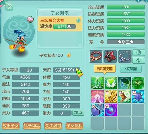 在《手把手指导养成黄帝普陀孩子(上)》的一文中,小编给大家讲解了子女的获得和养育等问题,今天给大家分享一下计划书。 1. 神功要诀 子女可以学习一本神功要诀,一般来说普陀孩子会学黄帝内经或火云法诀,其中黄帝内经对资质的影响最小,孩子的资质也相对好一些。计划书上会有给予神功的具体时间,按计划书来即可~ 需要注意的是,这个成就不只是给予神功的一方有成就,双方都有成就的。 2. 子女成年 经过30天的成长,子女可以举办成人礼。在这之后,你的小可爱就可以跟随你英勇地战斗了!如果有1项或2项属性达到100,还可以拿到成就。 孩子成年的时候自动获得第一门派技能“杨柳甘露”和神功上的技能“治疗”。 当孩子等级达到100级(人物达到至少95级),可以去找门派导师领取任务,让子女习得第二技能“灵贯三界”~ 需要注意的是,就算孩子的某一项永久属性是100,成年以后该项资质也不一定特别高。比如武学100,成年获得的攻击资质最高应该是1650,但是也可能浮动到1550。对普陀孩子来说,防御和体力资质都能达到1600以上,就是非常好了。如果对资质不满意,可以去姚婆婆处购买道具“羊脂凝露”来洗资质。给孩子佩戴饰品还可以提高资质。子女染色道具和饰品都可以在姚婆婆处买到~ 如图是一个不错的法体双百孩子。 孩子的寿命是永生,忠诚度也不会掉。 点击“加点”可以给孩子设置成长方向,第一次设置是免费的,以后再改需要30w现金。 很多养普陀孩子的玩家都是物理门派,建议给孩子加敏,卡够速度以后,按需要加点体质和耐力。 打书:孩子可以打2本兽决,戴护符。高级技能里,高神是必备的,普陀孩子自带神佑,这样可以达到30%的神佑概率。高幸运、高防御、高强壮、高敏捷、冥思、慧根等等的技能,按自己的情况打就行了。 成年子女需要维持温饱度,不然等级会降低。孩子状态页面的小感叹号有提示,把鼠标放在上面就可以看到~ 状态在90以上的孩子,每天有子女福利,普陀孩子的福利就是每天给你三级药。孩子这么孝顺,就不要心疼喂孩子的钱了! 子女变身:和人物的规则是一样的,这里不再赘述。不同的是,把变身卡直接给予子女, 就可以变身。 子女归属:比较重要的就是不能携带非亲生的子女离婚,别的规则就不是太需要注意了。比如A和B结婚,离婚后孩子归A;A再与C结婚,如果再离婚的话,C不能将孩子带走。 那么这次关于“《神武3》手把手指导养成黄帝普陀孩子(下)”的相关内容就到这里了,欢迎在下方留言讨论,了解更多神武3的相关内容请关注 叶子猪神武3专区。 |