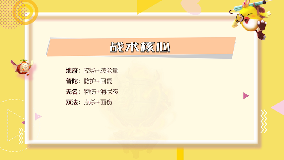 欢迎大家收看本期神武4电脑版《胜利公式》,今天为大家带来近期非常流行的“双法无名谷”阵容讲解,一起来看看吧! 在150等级段的比赛中,出现了很多“地府+普陀+无名谷+双法系”的阵容。其中,双法系多为魔天宫+龙宫,或双龙宫。那么,这个“双法无名谷”阵容为何流行,又为何在短期内让玩家纷纷效仿呢?今天我们就来好好分析一下。 此阵容的核心在于两个部分:高额面伤、高速补刀。 第一部分先说面伤。双法的持续群秒输出,配合普陀“灵耀九州”的伤害加成,其面伤压制力不容小觑!如再配合上虎翼阵阵技,便能在造成伤害的同时,也获得可观的回复。此外,无名谷的“魂飞斩”“千刃袭魂”技能可以驱散对手释放的法系减伤技能,如:“天地护法”、“灵贯三界”,从而保证双法系的高额伤害不受限制。 第二部分再讲高速补刀。此阵容拥有较多高速补刀手段,包括:无名谷登云之跃,配合龙宫龙隐、天宫夺魄咒、地府生死判等,均可完成高速击杀。尤其是点杀失败、对手残血时,即使对手明知要遭补刀,也依然无计可施。 而一个阵容的流行,必然会遭到克制,在地府“鬼影缠身”(减少对方能量)的广泛运用下,魔天宫的星爆“雷神之怒”受到了极大限制。 在104届神武之战总决赛中,风云再起A队则将魔天宫换成龙宫,在双法核心未改变的情况下,兼容性、消耗性更强,成功击败对手夺得冠军。 当然,任何战术都不是无解的。在第17届全明星赛事中,“天下无双”战队果断舍弃了主流的三输出阵容,将盘丝搬上舞台。这正是抓住了三输出阵容恢复能力较弱的缺点,利用“意乱”阻断对手恢复,并在关键时刻封印打断其输出,在一定程度上克制了三输出阵容。 尽管如此,在150等级段,该阵容仍然是一个主流阵容,足以胜任绝大多数的PK战斗! 其战术核心可以总结为: 地府:控场+减能量 普陀:防护+回复 无名:物伤+消状态 双法:点杀+面伤 这个兼具高速与清场的地府+普陀+无名+双法的组合,小伙伴们学会了吗? 本期胜利公式就为大家介绍到这里,小伙伴们可多加练习!我们下期再见! 欢迎在下方留言讨论,了解更多幻唐志的相关内容请关注 叶子猪幻唐志专区。 [编辑:ssc]